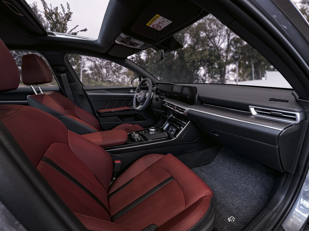 Интерьер Kia K5 Tulpar доступен в черном или новом красном исполнении, предлагается дополнительная отделка сидений кожей и аудиосистема JBL премиум-класса. Также в список оснащения включена система кругового обзора, которая обеспечивает быструю и удобную парковку.
