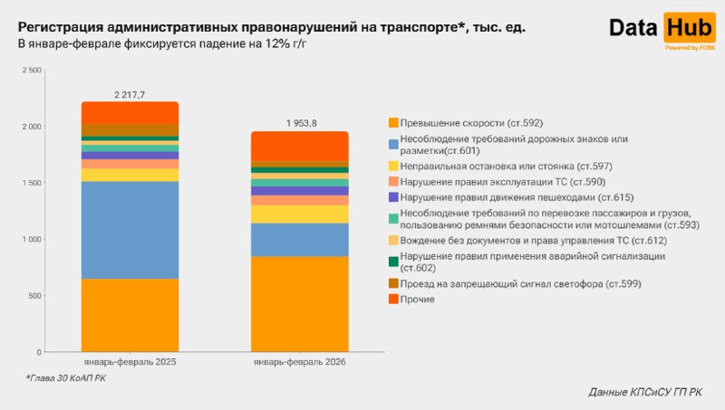 В январе-феврале 2026 года в Казахстане зарегистрировано 1,95 млн административных правонарушений на транспорте и в дорожном хозяйстве. Это на 12% меньше, чем за аналогичный период прошлого года, сообщает telegram-канал Data Hub со ссылкой на Комитет по правовой статистике и специальным учетам.