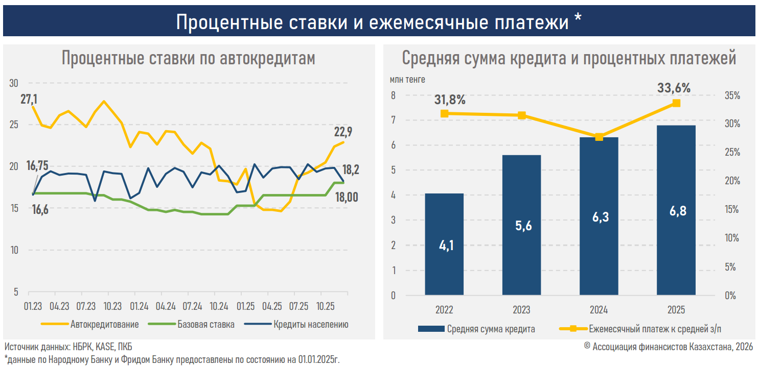 В 2025 году в Казахстане объем выдачи автокредитов составил 2,4 трлн тенге. Это на 29,8% больше, чем в 2024 году. Однако, в Ассоциации финансистов Казахстана отмечают признаки насыщения рынка. В IV квартале 2025 года средняя ставка по займам по покупку машины выросла до 22,9% (14,6% в III квартале), а объемы выдачи сократились на 11,6%.