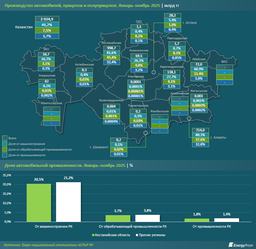 Значительный вклад в развитие автомобильной промышленности обеспечила Костанайская область, где сосредоточены основные производственные мощности (Allur). На регион пришлась почти половина общего объема выпуска автомобилей, прицепов и полуприцепов. Автопром занимает доминирующее положение в промышленной структуре области: его доля в машиностроении региона достигла 81,6%, в обрабатывающей промышленности – 45,4%, а в промышленности в целом – около трети, что фактически делает отрасль ключевым промышленным драйвером Костанайской области.