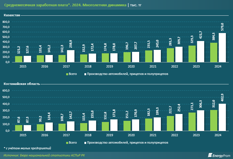 В Костанайской области, являющейся важнейшим автомобильным кластером страны, в 2015 году среднемесячная заработная плата в автопроме была ниже – хоть и лишь на 0,3% – среднерегионального уровня, а в 2024 году она превысила среднее значение по области на 29,1%, или на 90,9 тысяч тенге – 402,9 тысяч тенге против 312 тысяч тенге соответственно.