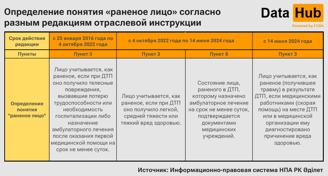 До июня 2024 года Министерство внутренних дел толковало понятие "раненое лицо" не так широко, как Комитет по правовой статистике и специальным учетам. Судя по всему, прежде к раненым оно относило только тех пострадавших в ДТП, кто получил заключение судебно-медицинской экспертизы. В публичных комментариях под обязательным медицинским подтверждением вреда здоровью ведомство, по всей видимости, имело в виду предоставление именно этого документа.