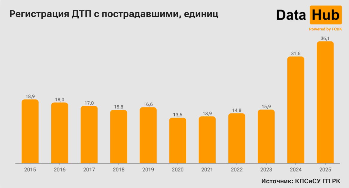 В Комитете по правовой статистике и специальным учетам заявляют о продолжающемся усилении взаимодействия с органами полиции – "проводится совместная работа по выстраиванию единой, согласованной практики учета пострадавших лиц, а также исключению практики укрытия ДТП". Значит, не только резкий взлет в 2024 году, но и повышенная динамика прошлого года в значительной степени обусловлена изменением практики учета раненых в ДТП лиц. Подобный вывод, к слову, подтверждается официальной статистикой: последние два года темпы роста раненых практически совпадают с темпами роста ДТП с пострадавшими, тогда как численность погибших по большому счету не меняется.