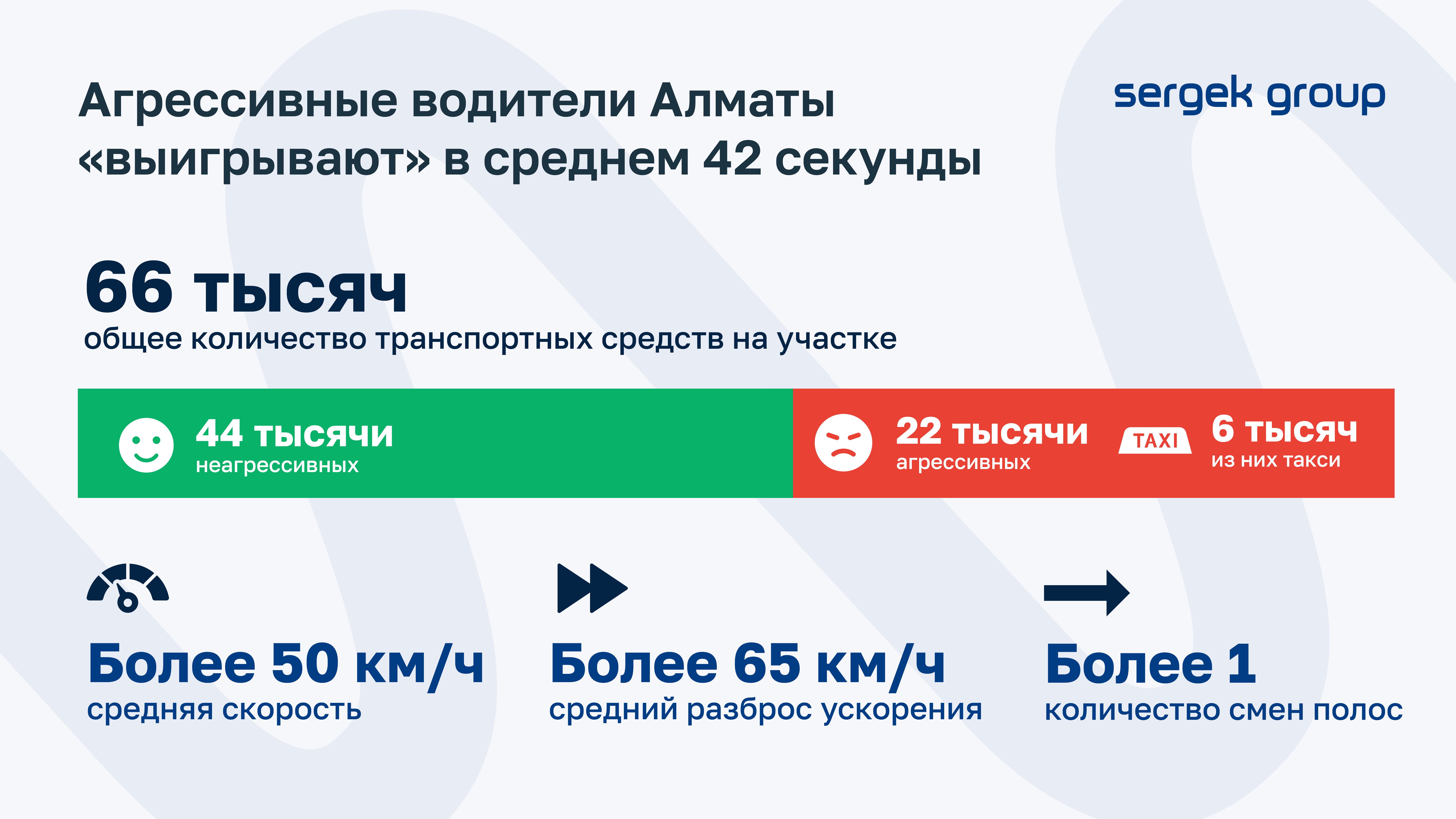 Исследование проводилось в Алматы. За критерии агрессивности аналитики взяли следующие параметры: более одного перестроения на участке, средний перцентиль скорости более 50% и средний разброс ускорения более 65 километров в час.