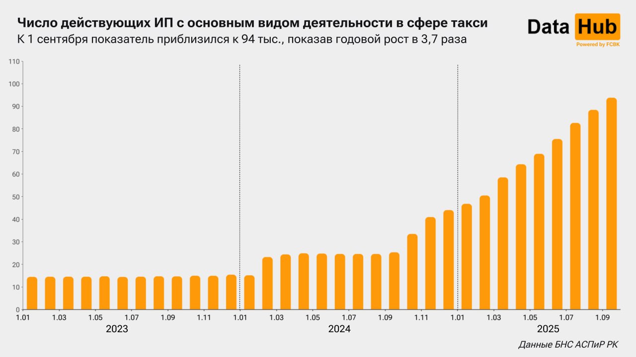 На 1 сентября 2025 года в Казахстане число действующих индивидуальных предпринимателей в сфере такси составило 93,8 тысяч. Это в 3,7 раз больше, нежели годом ранее, и на 6,1% больше, чем на 1 августе 2025 года. А в среднем с сентября 2024 года показатель рос средними месячными темпами в 11,8%, пишет telegram-канал Data Hub.