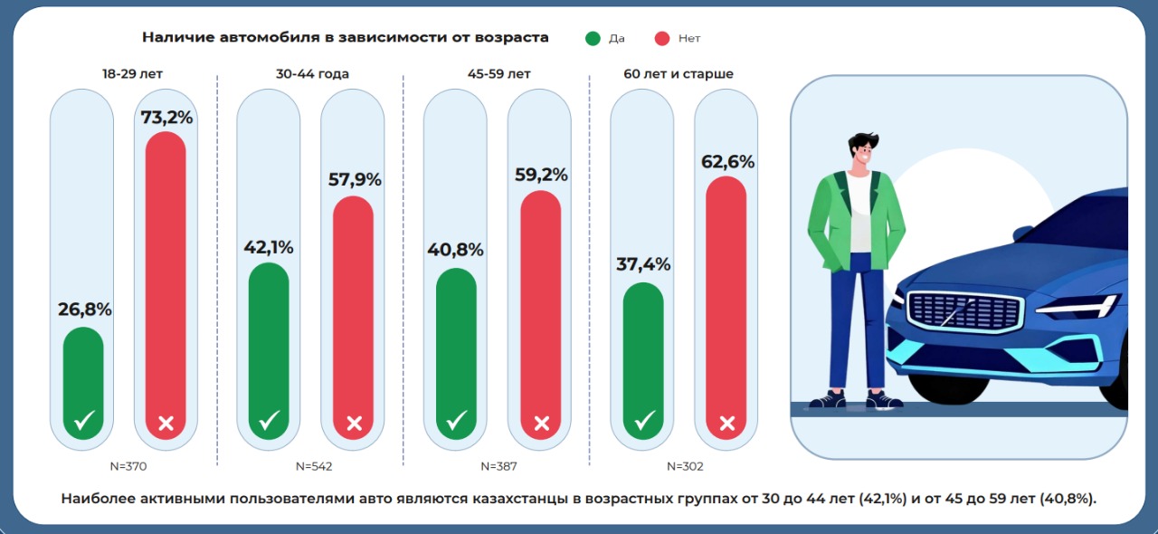 Более половины (55,9%) казахстанцев, не владеющих автомобилем, желают приобрести машину. Среди молодежи 74,8% отмечают, что хотели бы совершить такую покупку, а в группе 60 лет и старше таковых уже всего 27%.