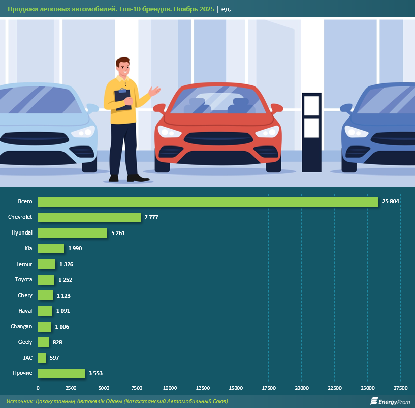 Автомобильная отрасль Казахстана бьёт рекорды. За ноябрь 2025 года были проданы рекордные 25,8 тысяч легковых автомобилей, из которых 7,8 тысяч авто пришлось на Chevrolet костанайской сборки. Следом идут Hyundai и Kia: 5,3 тысяч и две тысячи автомобилей соответственно, пишет портал Energyprom.