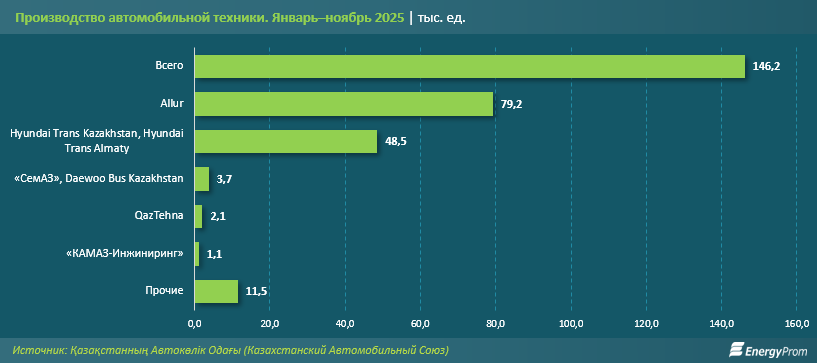 Лидирует Allur из Костанайской области: 79,2 тысяч единиц автомобильной техники за 11 месяцев текущего года, или 54,2% от всего производства в секторе по стране.
