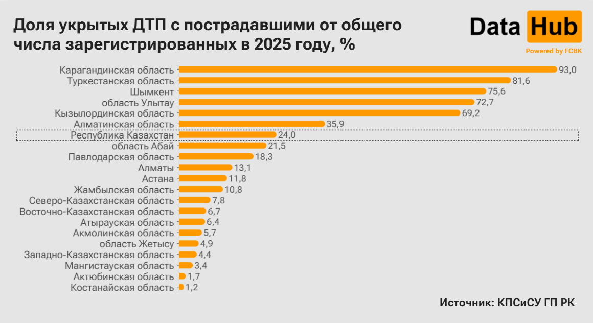 Регионы с наибольшим процентом укрытий – это Карагандинская, Туркестанская, Кызылординская, Улытауская области и Шымкент. Всего в них было укрыто 4,9 тысяч ДТП с пострадавшими из 6,2 тысяч зарегистрированных в 2025 году. То есть применительно к ним доля укрытий составляет 79%, тогда как применительно ко всем остальным регионам – 13% (3,8 тысяч из 30 тысяч).