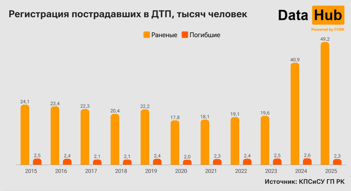 В Комитете по правовой статистике и специальным учетам заявляют о продолжающемся усилении взаимодействия с органами полиции – "проводится совместная работа по выстраиванию единой, согласованной практики учета пострадавших лиц, а также исключению практики укрытия ДТП". Значит, не только резкий взлет в 2024 году, но и повышенная динамика прошлого года в значительной степени обусловлена изменением практики учета раненых в ДТП лиц. Подобный вывод, к слову, подтверждается официальной статистикой: последние два года темпы роста раненых практически совпадают с темпами роста ДТП с пострадавшими, тогда как численность погибших по большому счету не меняется.